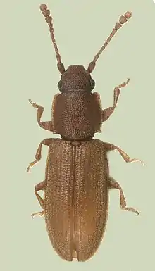 Silvanids generally are small, brownish, flattened, pubescent and densely punctured beetles ranging from 1.2-15mm in length, and mostly with a 5-5-5 tarsal formula. They have short, strongly clubbed, to very elongate antennae, and frequently grooves or carinae on the head and/or pronotum. Many genera have the lateral margins of the pronotum dentate or denticulate. The family is divided unequally into two subfamilies: Brontinae and Silvaninae. The Brontinae, arranged in two tribes (Brontini and Telephanini) of 10 genera each, are larger, loosely jointed beetles with long antennae, an especially elongate scape, inverted male genitalia, and mandibular mycangia.[4] Both brontine tribes have recently been reviewed at the genus level.[5][6] The Silvaninae, which has not been divided into tribes, consists of 48 genera of mostly smaller beetles characterized by their closed procoxal cavities, mostly without mandibular mycangia, and non-inverted male genitalia.[2]