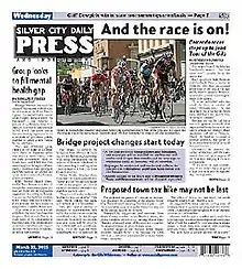 In 2008, the newspaper switched from using its own printing presses to outsourcing the job of printing the daily paper to Signature Offset, a printing firm located in Las Cruces, New Mexico.[13] The decision to hire an outside printing house was based on the cost of upgrading the press equipment at the Silver City Daily Press to digital technology.[13] At that time, the contents of the newspaper were sent to Signature Offset at 10 a.m. each day and distributed around Silver City by the afternoon of that same day.[13] Seven months later, the newspaper discontinued its Saturday edition due to economic factors, postal rates, and printing costs, and began devoting more time to its online edition.[14] Joseph "Joby" Aguirre, one of the pressman laid off from the Silver City Daily Press in 2008 when the newspaper discontinued its local printing operation, went on to be named 2010 Police Officer of the Year by Silver City Police.[15]