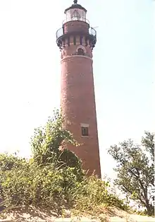 The park is 1.5 miles (2.4 km) wide and three miles (4.8 km) long and is divided into three segments: The northern area is an all-terrain vehicle dunes area where private motorized vehicle may be driven,[4] the middle of the park is a non-vehicle area (the Walking Dunes), and the southernmost section is leased to a private operator.[3] The park grounds include the Little Sable Point Light on Lake Michigan and one mile of shoreline on 690-acre (280 ha)[5] Silver Lake.[6]