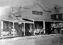 Immediately following the initial silver rush, a town site was platted and the town was built. The first permanent business building established in Silver Reef was a store at the intersection of the roads from the Buckeye, White, and East reefs.[29] By 1878, the town's business district consisted of a hotel, boarding houses, nine stores, six saloons, five restaurants, a bank, two dance halls, a newspaper called The Silver Echo (which later became the Silver Reef Miner),[30] and eight dry goods stores. Two cemeteries, one Catholic and one Protestant, were located south of Silver Reef's business district.[25] Most of the businesses in Silver Reef were situated along a mile-long Main Street.[31] The mining district consisted of 37 mines and five stamp mills: the Christy, Stormont, Leeds, Buckeye and Barbee & Walker mills.[6][32] Although it was surrounded by settlements with large Mormon populations, the town never had a Mormon meeting house. A Catholic church was the only church located within the town.[33] After the First transcontinental railroad was completed in 1869, many of the Chinese workers who had been hired to build it were out of work. Some returned to China, but others remained in Utah. A group of 250 of these workers set up a Chinatown in a level area just south of Silver Reef.[4] Silver Reef's Chinatown had a Chinese mayor and several businesses.[25] By 1879, Silver Reef's population had reached 2,000, and the town also had a horse race track, a brewery, and a brass band.[34] Shooting matches among members of the Silver Reef Rifle Club and sometimes residents of nearby towns took place on the horse race track.[35]