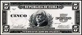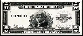 Cuban silver certificates (Spanish: Certificado De Plata) were banknotes issued by the Cuban government between 1934 and 1949 (and circulated from 1935 to the early 1950s). Prior and subsequent issues of Cuban banknotes were engraved and printed by nongovernmental private bank note companies in the United States, but the series from 1934 to 1949 were designed, engraved, and printed by the US government at the Bureau of Engraving and Printing (BEP).[1][2][3]