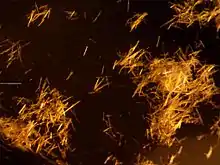 Silver fulminate, often in combination with potassium chlorate, is used in trick noise-makers known as "throw-downs", "crackers", "snappers", "whippersnappers", "pop-its", or "bang snaps", a popular type of novelty firework. They contain approximately 200 milligrams of fine gravel coated with a minute quantity (approximately 80 micrograms)[8] of silver fulminate. When thrown against a hard surface, the impact is sufficient to detonate the tiny quantity of explosive, creating a small salute from the supersonic detonation. Snaps are designed to be incapable of producing damage (even when detonated against skin) due to the buffering effect provided by the much greater mass of the gravel medium. It is also the chemical found in Christmas crackers[9] having first been used for that purpose by Tom Smith in 1860. The chemical is painted on one of two narrow strips of card, with abrasive on the second. When the cracker is pulled, the abrasive detonates the silver fulminate.