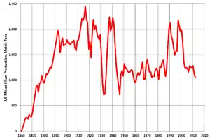 Interest in silver mining increased in recent years because of an increased price for the metal: the average silver price increased from $4.39 per troy ounce for the year 2001, to $13.45 per troy ounce for 2007.[2] In 2011, silver prices rose to almost $49 per troy ounce in April before dropping to around $34 per troy ounce in late June. In March 2016, the silver price was around $15 per troy ounce.[3][4]