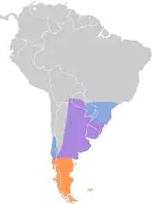 The silver teal's range includes southern Bolivia, southern Brazil, Paraguay, Argentina, Chile, Uruguay, South Georgia, South Sandwich Islands,[1] and the Falkland Islands.[5] The southernmost birds migrate to southern Brazil in the winter.