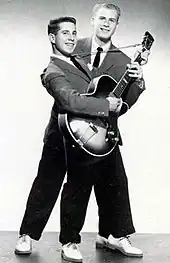 Under Big Records, Simon and Garfunkel assumed the name Tom & Jerry; Garfunkel named himself Tom Graph, a reference to his interest in mathematics, and Simon Jerry Landis, after the surname of a girl he had dated. Their first single, "Hey Schoolgirl", was released with the B-side "Dancin' Wild" in 1957.[15][22] Prosen, using the payola system, bribed DJ Alan Freed $200 to play the single on his radio show, where it became a nightly staple.[23] "Hey Schoolgirl" attracted regular rotation on nationwide AM pop stations, leading it to sell over 100,000 copies and to land on Billboard's charts at number 49.[23] Prosen promoted the group heavily, getting them a headlining spot on Dick Clark's American Bandstand alongside Jerry Lee Lewis.[24] Simon and Garfunkel shared approximately $4,000 from the song – earning two percent each from royalties, the rest staying with Prosen.[25] They released two more singles on Big Records ("Our Song" and "That's My Story") neither of them successful.[20][26][27]