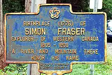 Fraser was born on 20 May 1776 in the village of Mapletown, Hoosick, New York.[2] He was the eighth and youngest child of Captain Simon Fraser (d.1779), of the 84th Highland Regiment, and Isabella Grant, daughter of the Laird of Daldregan. Captain Simon Fraser grew up at his family's seat, Guisachan (Scottish Gaelic: 'Giùthsachan'), as the second son of William Fraser (d.1755), 8th Laird of Guisachan and 3rd Laird of Culbokie, by his wife Catherine, daughter of John McDonell, 4th Laird of Ardnabie.[3] The Frasers of Guisachan and Culbokie were descended from a younger brother of the 10th Chief of the Frasers of Lovat.[4]