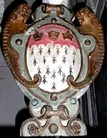 Arms of Leach: Ermine, on a chief engrailed[1] gules three ducal coronets or. Detail from top of monument to Sir Simon Leach