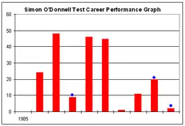 O'Donnell played as an all-rounder for Victoria in the Sheffield Shield between 1984 and 1993, scoring a century in his first match.[1] He went on to play 6 Test matches in 1985, 5 on the Ashes tour of England and one at home, but with a low bowling strike rate in 5 and 4 day cricket, he was more successful in the shorter form of the game.