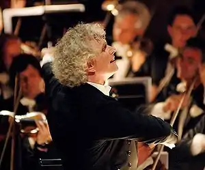 Sir Simon Denis Rattle OM CBE (born 19 January 1955) is a British-German[1] conductor. He rose to international prominence during the 1980s and 1990s, while music director of the City of Birmingham Symphony Orchestra (1980–1998). Rattle was principal conductor of the Berlin Philharmonic from 2002 to 2018. He has been the music director of the London Symphony Orchestra since September 2017. Among the world's leading conductors, in a 2015 Bachtrack poll, he was ranked by music critics as one of the world's best living conductors.[2]