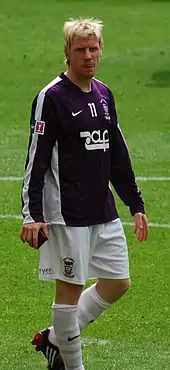 He finished his first season aft Kidderminster with 29 appearances and 2 goals as they were relegated to the Conference National.[6] He received a broken wrist in November 2005 that ruled him out for three months of 2005–06,[7] but made his return after two months when he featured as a 63rd-minute substitute against Altrincham on 2 January 2006.[8] He finished the season with 35 appearances and 2 goals.[8] After making 52 appearances and scoring 6 goals in 2006–07,[9] he signed a new one-year contract with the club, which saw him become their longest serving current player.[10] He picked up a thigh injury that ruled him out of the beginning of 2007–08 and returned to action in a 3–1 victory against Droylsden on 18 September 2007.[11][12] He finished the season with 36 appearances and 6 goals.[13]
