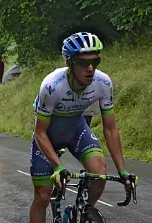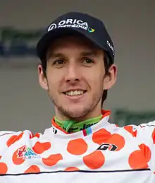 Yates along with his brother joined the Australian UCI World Tour team Orica–GreenEDGE in 2014.[17] He finished 12th overall in one of his first World Tour races, the Tour of the Basque Country. Yates suffered a broken collarbone on Stage 3 of the Tour of Turkey.[18] He recovered to take seventh overall and the young rider classification in the Tour of Slovenia in June. He was a surprise selection for the Orica–GreenEDGE team for the 2014 Tour de France, with only 5 days' notice, and was one of only 4 British riders to take to the Grand Depart startline in Leeds.[19] Yates featured in two breakaways during his Grand Tour debut, before being withdrawn by his team on the second rest day.[20]