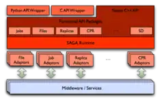 The SAGA API defined a mechanism to specify additional API packages which expand its scope. The SAGA Core API itself defines a number of packages: job management, file management, replica management, remote procedure calls, and streams. SAGA covers the most important and frequently used distributed functionality and is supported and available on every major grid systems - Extreme Science and Engineering Discovery Environment (XSEDE), EGI and FutureGrid. SAGA not only supports a wide range of distributed programming and coordination models but is also easily extensible to support new and emerging middleware.[2][3]