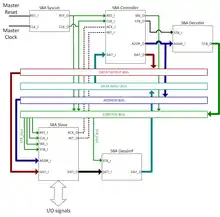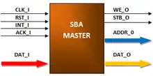 SBA is an application and a simplified version of the Wishbone[2] specification. SBA implements the minimum essential subset of the Wishbone signals interface. It can be connected with simple Wishbone IP Cores. SBA defines three types of cores: masters, slaves, and auxiliaries. Several slave IP Cores were developed following the SBA architecture, many to implement virtual instruments.