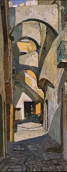 Oil painting by Antonio Sicurezza of an alleyway with flying buttresses between buildings