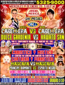 The Mexican wrestling company Consejo Mundial de Lucha Libre (Spanish for "World Wrestling Council"; CMLL) has held a number of major shows over the years using the moniker Sin Piedad ("No Pity" or "No Mercy"). CMLL has intermittently held a show billed specifically as Sin Piedad since 2000, primarily using the name for their "end of the year" show in December, although once they held a Sin Piedad show in August as well. CMLL has on occasion used a different name for the end-of-year show but Sin Piedad is the most commonly used name. All Sin Piedad shows have been held in Arena México in Mexico City, Mexico which is CMLL's main venue, its "home".[2] The 2018 Sin Piedad was the third first show to be held on New Year's Day after being held on the same day in 2016 and 2017.[3][4][5]