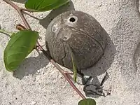 Different versions of the legend are told in different countries in Oceania.[4] The coconut tree (Cocos nucifera) has many uses and is an important source of food. It is also used for making coconut oil, baskets, sennit rope used in traditional Samoan house building, weaving and for the building of small traditional houses or fale. The dried meat of the coconut or copra has been an important export product and a source of income throughout the Pacific.