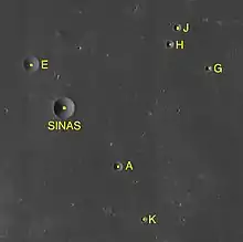 ![]() Apollo 15 Mapping Camera image. Sinas near center, Sinas E in upper left, and Sinas A in lower right | |
