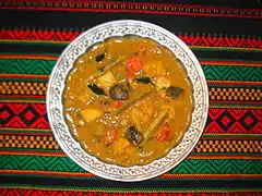 Sindhi cuisine (Sindhi: سنڌي کاڌا) refers to the distinct native cuisine of the Sindhi people from Sindh, Pakistan. Sindhi cuisine has been influenced by Central Asian, Iranian, Mughal food traditions.[1] It is mostly a non-vegetarian cuisine,[2] with even Sindhi Hindus widely accepting of meat consumption.[3] The daily food in most Sindhi households consists of wheat-based flat-bread (phulka) and rice accompanied by two dishes, one gravy and one dry with curd, papad or pickle. Freshwater fish and a wide variety of vegetables are usually used in Sindhi cuisine.[4] Restaurants specializing in Sindhi cuisine are rare, although it is found at truck stops in rural areas of Sindh province, and in a few restaurants in urban Sindh.[5]