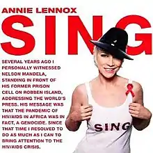 Afterwards, Lennox developed The SING Campaign which aimed to raise funds and awareness for issues surrounding HIV/AIDS. She also wrote on her official website that the song is about raising money and awareness for what she considers to be an HIV/AIDS genocide. Citing Mandela's speech in which he said, "Let us use the universal language of music, to sing out our message around the world", Lennox wanted "Sing" to be an anthem and symbol of unity and empowerment, to help spread awareness in the world.[3] "Because the incidence of HIV AIDS is on the rise for women, especially in the pandemic across the whole of the African continent, I thought perhaps I could be of benefit by writing a song and empowering those women who do not have an international voice," the singer clarified.[4]
