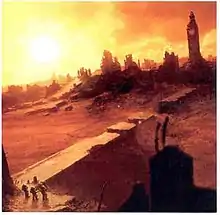 Muse's rocket then docks with a 'Cryo Module' that is housing hundreds of people in a state of cryogenic suspension, which is revealed in the extended version of the video. It could be speculated that Muse's mission is to populate their destination planet. The spacecraft and its attached module enter a hyperdrive-like wormhole. The ship eventually exits into an asteroid field above an orange planet. The pilot (Bellamy) steers the ship to avoid colliding with the asteroids but ends up failing to completely avoid an especially large one. The cryo module collides with it, damaging the docking collar and sending them somewhat out of control. The cryo module is detached, and the spacecraft gains speed as it enters the orange planet's atmosphere. The brakes on the ship fail, and they crash, sliding a very large distance from the incredible speed. Muse is next seen standing on a cliff, looking out over a large landscape. As the camera zooms out, the Houses of Parliament and Big Ben in London can be seen, completely in ruin buried beneath large collections of dirt and sand. It can be speculated that they are the last remaining survivors on the planet, however, the final shot of the detached Cryo Module drifting in space implies that the last surviving humans are actually those left frozen inside, ending the video on a darkly ironic note.
