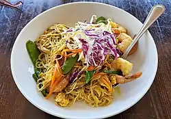 Singapore-style noodles (Chinese: 星洲炒米; pinyin: xīngzhōu chǎomǐ; Jyutping: sing1 zau1 caau2 mai5) is a dish of stir-fried cooked rice vermicelli, curry powder, vegetables, scrambled eggs and meat, most commonly chicken, beef, char siu pork, or prawns.[1] Singapore noodles are a Cantonese creation, and are very common in Cantonese-style and takeaway restaurants in Hong Kong.[2][3]