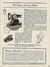 - Singer's 1924 advertising card deck included a 'Cardinal' card, published in the early years of pillar-mount motors, which states: "The machine starts when you press lightly on the treadle, and as you press harder, the machine sews faster." Meanwhile the 'House Wren' advertising card, published in the same deck, has a picture on its reverse side showing the rheostat atop the tredal pad with the woman's foot resting on it; the accompanying text reads "[...] Your heel rests comfortably on the floor. [...]"