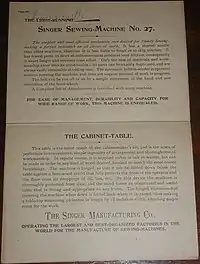 The Singer Model 27 and later model 127 were a series of lockstitch sewing machines produced by the Singer Manufacturing Company from the 1880s to the 1960s. (The 27 and the 127 were full-size versions of the Singer 28 and later model 128 which were three-quarter size). They were Singer's first sewing machines to make use of "vibrating shuttle" technology. Millions were produced.[lower-alpha 1] They are all steel and cast iron, and were built before the advent of planned obsolescence, and so they were designed to be repaired rather than replaced.[lower-alpha 2] Consequently many remain today, some in collections and others still in service. In company literature they were called "the woman's faithful friend the world over".[2]