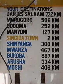 Paved Trunk road T3 from Morogoro to the Rwandan border passes through the town. Paved trunk road T14 connects Singida with Babati in Manyara Region. The distance from Singida to Dodoma is 252 km, to Shinyanga 300 km, to Arusha 334 km and to Mwanza 467 km.[2]