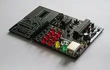 Single-board "keypad and calculator display" microcontrollers of this type were very similar to some low-end microcomputers of the time, such as the KIM-1 or the Microprofessor I.[4] Some of these microprocessor "trainer" systems are still in production today, used as very low-cost introductions to microprocessors at the hardware programming level.[5]