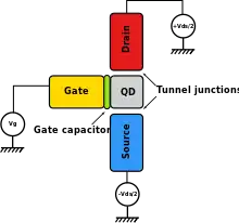 A single-electron transistor (SET) is a sensitive electronic device based on the Coulomb blockade effect. In this device the electrons flow through a tunnel junction between source/drain to a quantum dot (conductive island). Moreover, the electrical potential of the island can be tuned by a third electrode, known as the gate, which is capacitively coupled to the island. The conductive island is sandwiched between two tunnel junctions[1] modeled by capacitors, and , and resistors, and , in parallel.