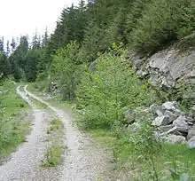 Singletrack (or single track) describes a type of mountain biking trail that is approximately the width of the bike. It contrasts with double-track or fire road which is wide enough for four-wheeled off-road vehicles. It is often smooth and flowing, but may also feature technical rocky sections, go over tree roots, and include berms, banked turns, switch-backs, hills, drops, jumps, and so forth. Singletrack which descends significantly, and in the most downward direction, is said to be following the fall line.[1]