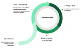 Sinking cities are urban environments that are in danger of disappearing due to their rapidly changing landscapes. The largest contributors to these cities becoming unlivable are the combined effects of climate change (manifested through sea level rise, intensifying storms, and storm surge), land subsidence, and accelerated urbanization.[2] Many of the world's largest and most rapidly growing cities are located along rivers and coasts, exposing them to natural disasters. As countries continue to invest people, assets, and infrastructure into these cities, the loss potential in these areas also increases.[3] Sinking cities must overcome substantial barriers to properly prepare for today's dynamic environmental climate.