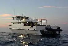 The sinking of MV Conception occurred on September 2, 2019, when the 75-foot (23 m) dive boat caught fire and eventually sank off the coast of Santa Cruz Island, California, United States. The boat was anchored overnight at Platts Harbor, a small undeveloped bay on the island's north shore, with 33 passengers and 1 crew member asleep below decks when a fire broke out shortly after 3 a.m. Five crew members, whose sleeping quarters were on the top deck, survived while everyone else on board died. The crew members were forced by the fire to jump overboard but not before placing an initial mayday call to the Coast Guard and attempting to alert the passengers. The crew retrieved the Conception's skiff and motored to a nearby boat where a second radio dispatch was made. The rescue and recovery operations were coordinated by the United States Coast Guard.[1][2]