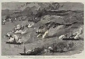 Courbet followed up this success on 1 March by locating Kaiji, Nanchen and Nanrui, which had taken refuge with four other Chinese warships in Zhenhai Bay, near the port of Ningbo. Courbet considered forcing the Chinese defences, but after testing its defenses finally decided to guard the entrance to the bay to keep the enemy vessels bottled up there for the duration of hostilities. A brief and inconclusive skirmish between the French cruiser Nielly and the Chinese shore batteries on 1 March enabled the Chinese general Ouyang Lijian (歐陽利見), charged with the defence of Ningbo, to claim the so-called 'Battle of Zhenhai' as a defensive victory.[45]