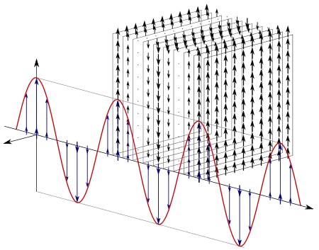 Represented in the first illustration toward the right is a linearly polarized, electromagnetic wave. Because this is a plane wave, each blue vector, indicating the perpendicular displacement from a point on the axis out to the sine wave, represents the magnitude and direction of the electric field for an entire plane that is perpendicular to the axis.
