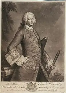 Knowles spent the next few months cruising, before returning to England in company with HMS Torrington as an escort for a 25 ship strong fleet of merchantmen.[9] Knowles and the Diamond arrived at Spithead on 4 August 1740, shortly after which Knowles took command of the 50-gun HMS Lichfield. He soon moved to command the 60-gun HMS Weymouth, and sailed with her from St Helens Roads on 24 October 1740 as part of Sir Chaloner Ogle's fleet to reinforce Vernon in the West Indies.[3][9] Knowles formed part of Vernon's council of war on 16 February 1741, which resolved to make a naval and land assault on Cartagena. Vernon placed Knowles in command of the operations to reconnoitre the Spanish defences, and subsequently draw up a plan of attack.[10] Having done this Knowles formed a key part of the early stages of the attack, he stormed and captured one of the forts, captured the Spanish flagship and broke the boom across the entrance to the harbour, allowing the British fleet access.[3][11]