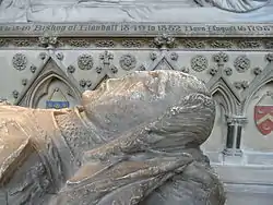 The crest is also not without confusion, being given variously as a "heathcock" (another name for partridge, of the pheasant family), a "moorcock",[6] a "fieldcock", (a vague term possibly denoting grouse), a blackcock, (of the grouse family) and is shown on the Earl Landaff memorial in a form akin to a farmyard cock or rooster. The effigy of Sir David does however show most of the bird forming the crest of his helm upon which he rests his head, but it is missing the head. The feet are short and sturdy, suggesting a grouse-type bird and are not the long legs of a rooster[lower-alpha 5] A gilded bird, probably a dove, is used as a foot-rest in the effigy of St Teilo in Llandaff Cathedral.
