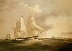 ![]() Ship Sir George Seymour sailing down the Channel with other shipping with the coast in the background. W.T. Howard, National Maritime Museum, Greenwich | |