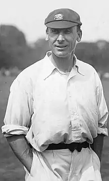 Hobbs toured Australia with the MCC during the 1920–21 season,[162] under the captaincy of J. W. H. T. Douglas, when Australia won every match of the five-Test series. He was one of the few English successes.[163][164] He scored two centuries in the opening three first-class games,[34] and in the first Test top-scored in both England innings with 49 and 59.[34][165] In the second Test, he scored 122 on a difficult pitch which had been affected by rain.[166] Wisden commented that this was "from the English point of view, the finest innings of the tour".[167] He also scored a century in defeat in the third Test, hitting 123 in the final innings as England failed to score 489 to win the game.[168] He did not pass 50 again in the series; after a failure on the fourth Test,[34] he tore a thigh muscle batting in a game before the final Test. Persuaded by Douglas to play anyway, he scored 40 and 34 but struggled to field effectively. One unsuccessful attempt to chase the ball caused some of the crowd to jeer him, which led to controversy when two amateur members of the team, Percy Fender and Rockley Wilson, wrote scathingly about the incident.[169] Hobbs scored a total of 924 first-class runs on the tour, at an average of 51.33;[39] in Test matches, he scored 505 runs at 50.50.[68] Although he and Rhodes resumed their opening partnership, apart from in the first Test, when C. A. G. Russell partnered Hobbs, they could not replicate their former successes,[170] and shared only one stand worth more than fifty.[170]