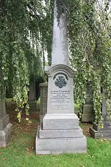 He is buried on the north side of the main east-west path in Dean Cemetery in Edinburgh under a large pale grey granite obelisk.