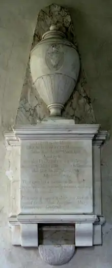 He died on 28 May 1811[32] and was buried in All Saints Church, Clovelly, next to Clovelly Court. Monuments (both by T. King & Sons of Bath) survive in the church to the 1st Baronet, showing a seated woman by an urn, and to his wife, showing a standing woman by an urn.[33]