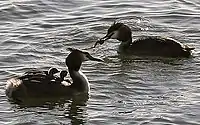 Huxley's first 'trial run' was the treatment of evolution in the Science of Life (1929–30), and in 1936 he published a long and significant paper for the British Association.[44] In 1938 came three lengthy reviews on major evolutionary topics.[45][46][47] Two of these papers were on the subject of sexual selection, an idea of Darwin's whose standing has been revived in recent times.[48][49] Huxley thought that sexual selection was "…merely an aspect of natural selection which… is concerned with characters which subserve mating, and are usually sex-limited". This rather grudging acceptance of sexual selection was influenced by his studies on the courtship of the great crested grebe (and other birds that pair for life): the courtship takes place mostly after mate selection, not before. Huxley tackled the subject of evolution at full length, in what became the defining work of his life. His role was that of a synthesiser, and it helped that he had met many of the other participants. His book Evolution: The Modern Synthesis was written whilst he was secretary to the Zoological Society, and made use of his collection of reprints covering the first part of the century. It was published in 1942. Reviews of the book in learned journals were little short of ecstatic; the American Naturalist called it "The outstanding evolutionary treatise of the decade, perhaps of the century. The approach is thoroughly scientific; the command of basic information amazing".[50][51]