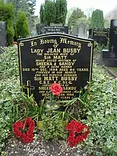 He was buried in Southern Cemetery, Manchester, alongside his wife Jean. His friend Willie Satinoff, who owned a racecourse and died in the Munich air disaster, is buried in the same cemetery. Two days after Busby's death, a minute's silence was held at the start of United's home game against Everton in the Premier League. United finished that season as double winners, lifting the league title and FA Cup.[34]