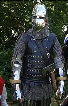 The reconstruction of Sir Thomas Griffin's armour circa 1360, is based research on evidence from the Battle of Visby in 1361, English effigies and monumental brass of the period. It consists of the following elements: Klappvisier bascinet with mail aventail, quilted arming cap, gambeson, mail shirt, coat of plates based on the Visby No.1 coat of plates, simple jointed arm harness, hour glass gauntlet (glove), linen hose, pair of greaves, pair of sollerets, pair of knee cops or poleyn, padded chausses, mail chausses or with splint armour reinforcement consisting of thick leather and steel splints.