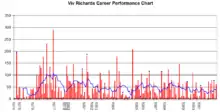 Richards made his test debut in 1974 against India along with Gordon Greenidge. His best years were between 1976 and 1983 where he averaged a remarkable 66.51 with the bat in test cricket. In 1984 he suffered from pterygium and had an eye surgery[13] which affected his eyesight and reflexes.[14] Despite this, he remained the best batsman in the world for the next four years, averaging 50. His form declined in the latter years of his career where he averaged 36. Overall, Richards scored 8,540 runs in 121 Test matches at an average of 50.23 and retired as then West Indies leading run scorer overhauling the aggregate of Garfield Sobers.[15] He also scored 1281 runs in World Series Cricket with five tons at average of over 55 which was regarded as highest and most difficult cricket ever played.[16] As a captain, he won 27 of 50 Test matches and lost only 8. He also scored nearly 7,000 runs in One Day Internationals and more than 36,000 in first-class cricket.