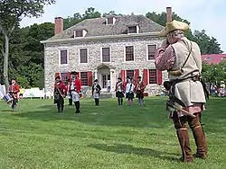 In 1748, Johnson built a new stone house upriver from Mount Johnson, which became known as Fort Johnson.[25] The home was strongly fortified when the next war approached. In 1755, Johnson shifted the primary meeting place for diplomatic councils between the British and the Iroquois from Albany to Fort Johnson.[26] He also bought houses in Schenectady and Albany to stop at on his business trips to New York Town.[27]