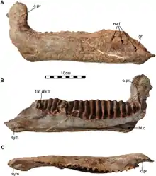 Described in 2015 by Thai palaeontologists Masateru Shibata, Pratueng Jintasakul, Yoichi Azuma and Hai-Lu You, Sirindhorna was one of eighteen dinosaur taxa from the year to be described in an open access or free-to-read journal.[1][3] It's the third species of iguanodont found in Thailand, following Siamodon and Ratchasimasaurus, both known from poorer material, and the first ornithopod from Southeast Asia to have a well-preserved skull. The type and only species of the genus is Sirindhorna khoratensis. The taxon is known from the holotype specimen NRRU3001-166, an articulated braincase, as well as a number of disarticulated referred specimens. The material known from these referred specimens consists of three more partial braincases, one with an articulated postorbital, one right premaxilla, a left and right maxilla, a right jugal, surangular, and quadrate, one predentary, a right and left dentary, and assorted teeth. The generic name is dedication to Princess Maha Chakri Sirindhorn for her contribution to the support and encouragement of palaeontology in Thailand. The specific name is derived from Khorat, the informal name of Nakhon Ratchasima Province.[1]
