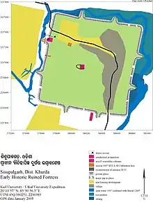 The first excavations at the site were carried out by B.B. Lal in 1948. An American-Indian team took up work in 2001. In 2005 ground penetrating radar revealed the probable position of the southern moat.[5] Toward the centre of the fortress (Area D) the 19 column structure has been recorded three-dimensionally by means of a laser scanner. It is disturbed and incomplete. Two gates pierce each of the glacis of the quadrangular plan. As at contemporary Jaugada, the plan tips 10° clockwise of north.[6] With 1,125 m × 1,115 m (3,691 ft × 3,658 ft) (measured on the crest), Sisupalgarh is larger in surface than is Jaugada. Sisupalgarh's defences are the highest known of this period in India. The ancient settlement probably was not dense, but rather there was room inside the fortress to graze.