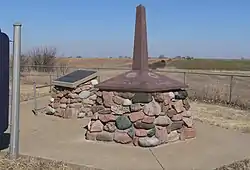 Site No. JF00-072 is a survey monument located at the quadripoint of Republic and Washington counties in Kansas and Jefferson and Thayer counties in Nebraska. The monument marks the intersection of the sixth principal meridian and its baseline, the 40th parallel north; it serves as the initial point of all land surveys in Kansas and Nebraska, as well as most of Wyoming and Colorado, and part of South Dakota. The original sandstone monument was 6 feet (1.8 m) tall. U.S. Deputy Surveyor Charles A. Manners set the monument in 1856. The monument was later buried under a county roadbed; it was unearthed and reburied twice before being dug up for good in 1986, though its middle section is now missing.[2]