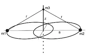 The system consists of two primary bodies with the same mass , which move in circular or elliptical Kepler orbits around their center of mass. The third body, which is substantially smaller than the primary bodies and whose mass can be set to zero , moves under the influence of the primary bodies in a plane that is perpendicular to the orbital plane of the primary bodies (see Figure 1). The origin of the system is at the focus of the primary bodies. A combined mass of the primary bodies , an orbital period of the bodies , and a radius of the orbit of the bodies are used for this system. In addition, the gravitational constant is 1. In such a system that the third body only moves in one dimension – it moves only along the z-axis.